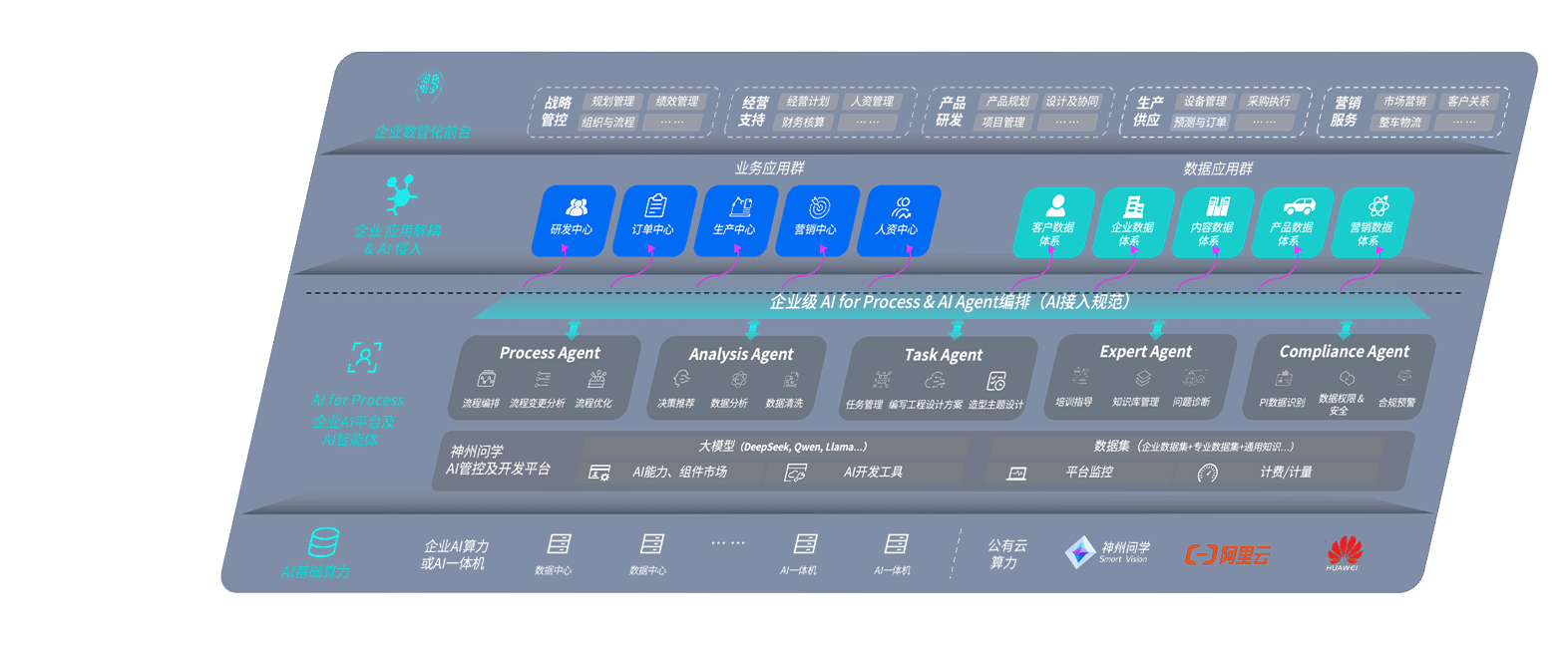 端到端的一站式AI工作空间深度融合了从企业战略规划到日常经营的全流程业务板块,,,,定向解决车企内部领域多、、部门多、、、链条长、、、、场景碎片化等难题,,,,支持车企快速构建以AI为核心的生产力写作体系,,实现任务执行与AI能力的无缝集成与交互